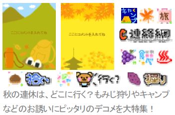 コンテンツ内容:秋の連休は、どこに行く?もみじ狩りやキャンプなどのお誘いにピッタリのデコメを大特集!
