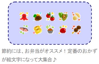 コンテンツ内容:節約には、お弁当がオススメ!定番のおかずが絵文字になって大集合♪