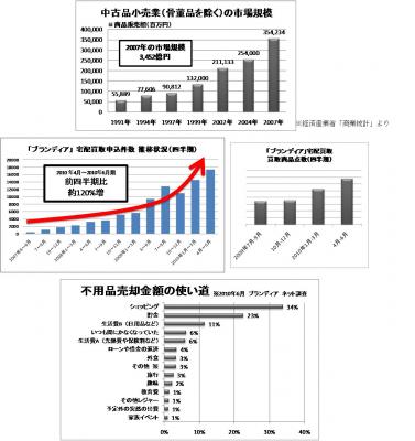 2007年の中古市場規模は3,452億円※、今後5,000億円までに成長すると言われています。宅配買取利用者No.1の「ブランディア」(1)は、不況による節約志向やエコ意識の高まりも影響し、申込数は15万人を突破(2010年8月時点)、前四半期比約120%増※、オークション販売においては、2009年ベストストア賞を受賞するなど成長中ですが、同時に商品の仕入れ競争も激化しております。