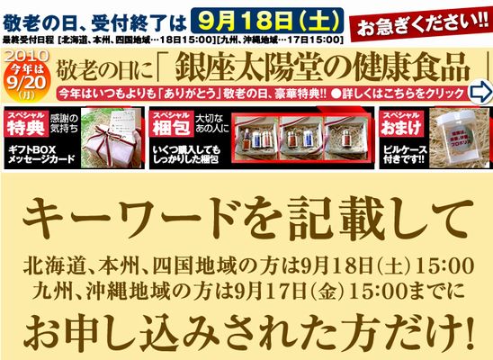 敬老の日に、「銀座太陽堂の健康食品」をご購入いただきました方に、特典をご用意させていただいております。
