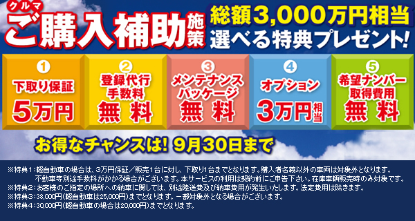 株式会社カーチス(本社:東京都墨田区 代表取締役社長 森本 貴史)は、9月4日(土)~9月30日(木)の期間、カーチスの大型販売店では、『クルマご購入補助施策』としてキャンペーンを開催。対象店舗にてご成約された方の特典として、総額3,000万円相当の選べる特典をご用意致しました。