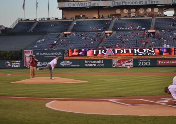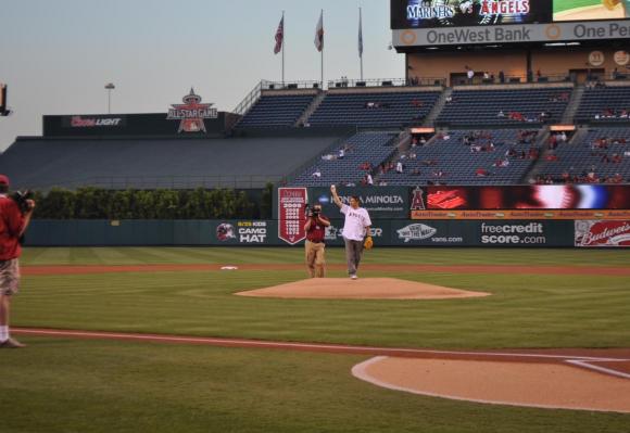エンゼルスのユニフォーム姿で登場した今野は、この日キャッチャーを務めた1塁手の「Mark Trumbo」選手のキャッチャーミットに見事なストライクを披露。「始球式前に松井選手と話す機会もあり、とてもエキサイティングな始球式でした。ストライクで締めくくり、生涯最高の思い出になりましたね。」と満面の笑みを見せました。当日は松井選手とイチロー選手の直接対決があり、エンゼルスが4-3で延長戦を制しました。
