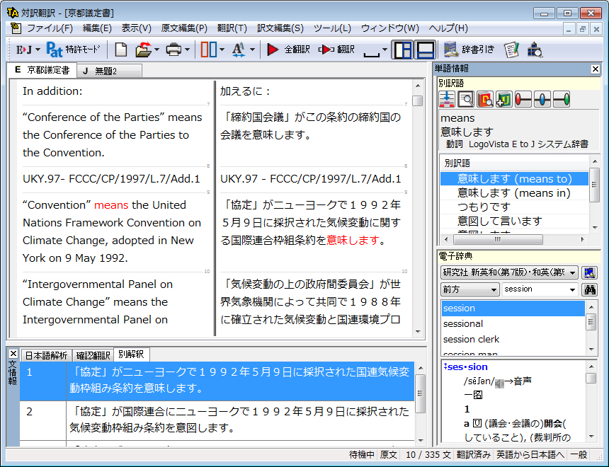 最善な翻訳に欠かせない辞書語数の充実をはかりました。ベーシックが642万語(英日辞書346万語、日英辞書296万語)、フルパックが978万語(英日辞書346万語、日英辞書296万語+著名なビジネスシーンで使用される専門辞書合計336 万語(英日・日英辞書各8 分野)とし、業界最大の辞書数を搭載します。