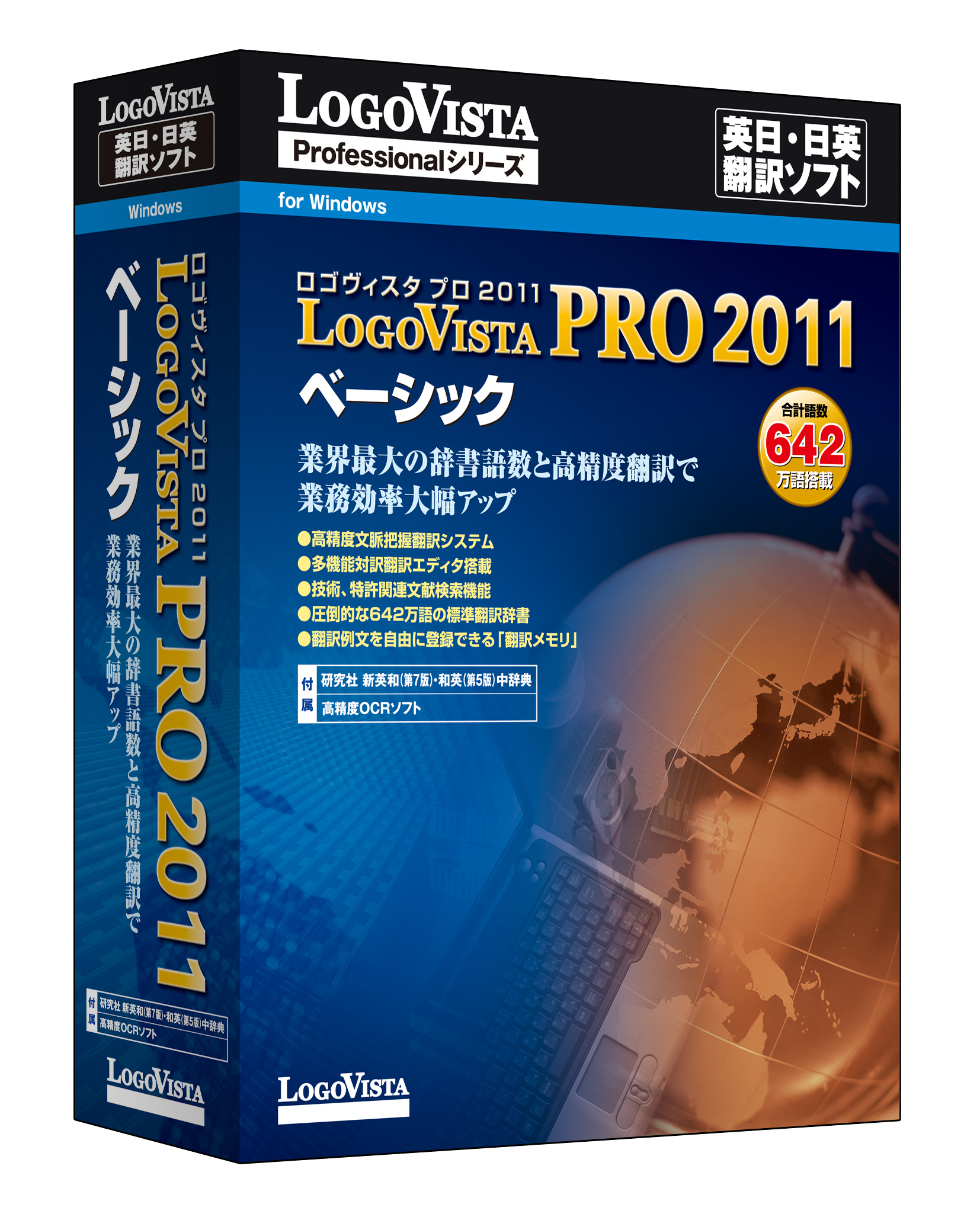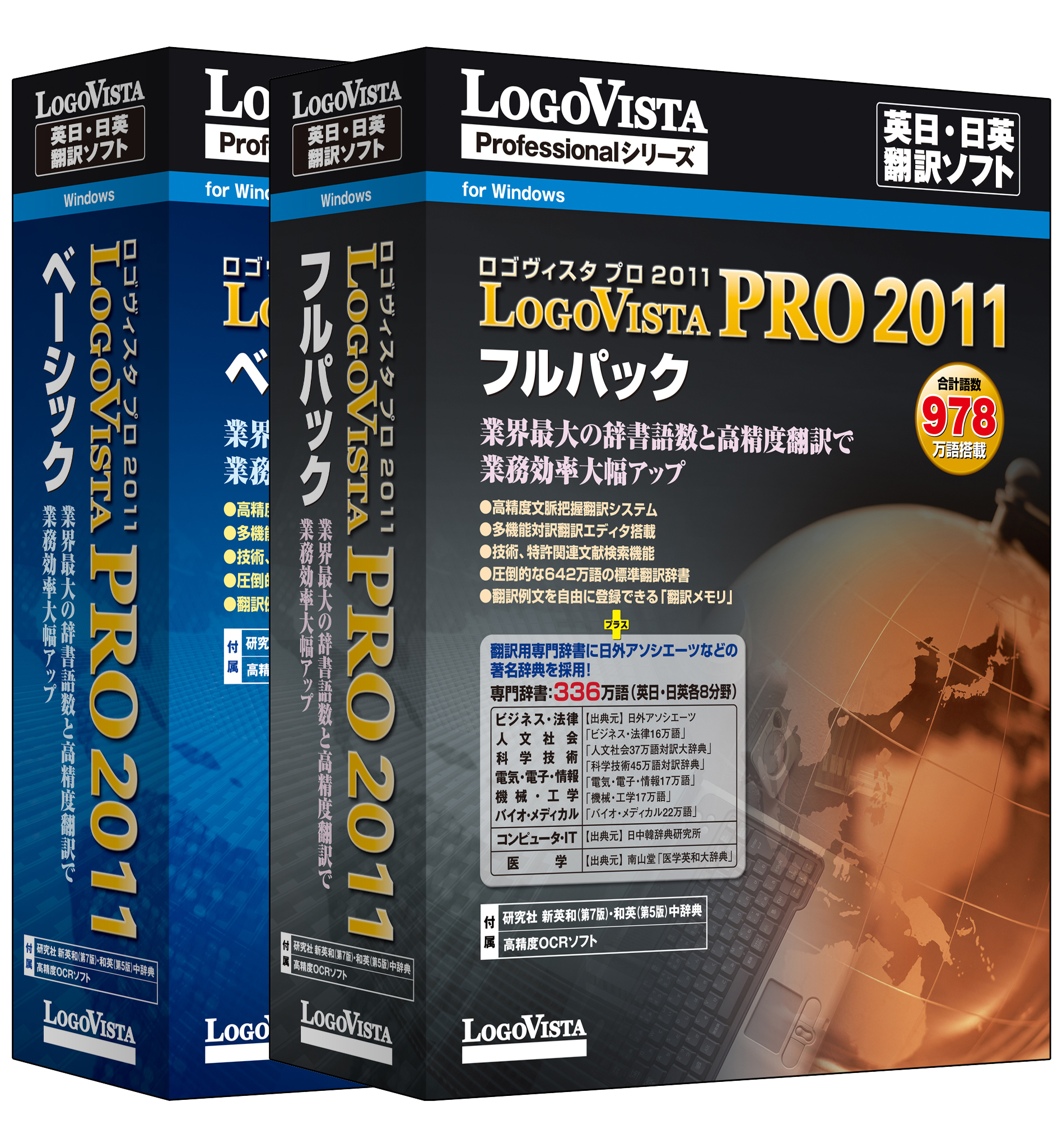 同時発売の上位モデル「LogoVista PRO 2011 フルパック」では、翻訳辞書の総語数が978万語(642万語+著名なビジネスシーンで使用される専門辞書合計336 万語(英日・日英各8 分野))と業界最大の辞書語数を搭載し、翻訳業務を強力にバックアップします。