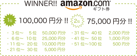 なお、Amazonギフト券は1位の方に10万円分、以下2位の方に7万5千円分、3位~5位の方に5万円分、以下2万5千円分、1万円分、5千円分、2千円分、1千円分、500円分がそれぞれ100位の方まで贈られます。