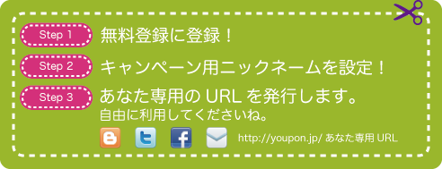 Youponご紹介キャンペーンでは、Youponにご登録のユーザー様にYouponが「ユーザー専用URL」を発行します。「ユーザー専用URL」はTwitterやブログなどに自由に張り付けていただいてかまいません。