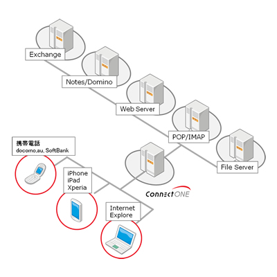 株式会社コネクトワンはMS Exchange、IBM Lotus Notes/Domino、Fileサーバー、POP、Webアプリケーションなど企業の多様なシステムへの接続に高い技術を持ち、数千~数万規模のエンタープライズ案件や大手サービスプロバイダーへのOEM供給実績は業界でNo.1を誇ります。