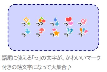 コンテンツ内容:語尾に使える「っ」の文字が、かわいいマーク付きの絵文字になって大集合♪