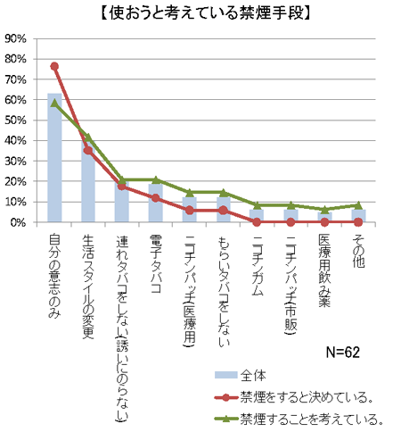 次ぐ「生活スタイルの見直し」や「連れタバコをしない」など、お金をかけずに禁煙を試みる率が高く、経済的理由で禁煙する率が多いだけに禁煙手段も「お金をかけたくない」人が多い傾向にあると考えられる。