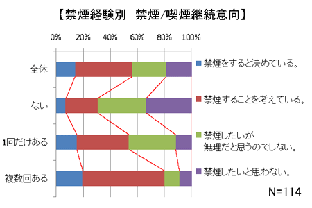 更に、喫煙者の「禁煙経験」別に、「禁煙/喫煙継続意向を見てみると、今までの禁煙回数が多い人の方が、「禁煙派」が高い傾向にあり、“禁煙再チャレンジ”層の割合の高さがうかがえる。