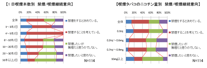 また、喫煙しているタバコの「ニコチン量」別に意向を見ても、ニコチン量が多いほど同様の傾向があり、“ヘビースモーカー“ほど、禁煙を完全に決めている人と、喫煙を断念している人の二極化傾向が見られる。