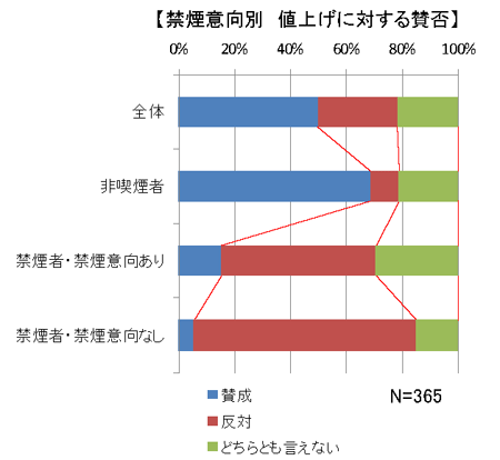非喫煙者を含めた賛否については、賛成半数、反対約25%の割合。喫煙者も10%は値上げに「賛成」という結果。特に喫煙者の中でも“禁煙派”の賛成パーセンテージが高いのは、「やめるきっかけになる」と期待している人が多いためと、考えられる。