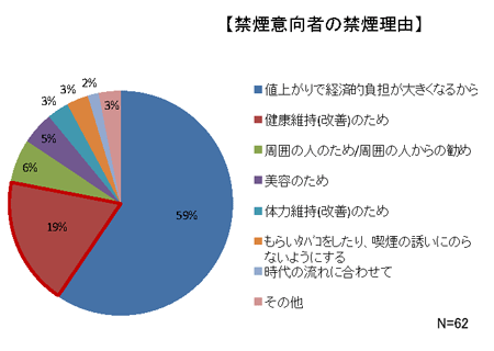 禁煙派が今回禁煙をするもっとも大きな理由をひとつだけ聞いたところ、今回の値上げをきっかけに禁煙を決めているにも関わらず、「値上がりで経済的負担が大きくなるから」は60%程度にとどまった。