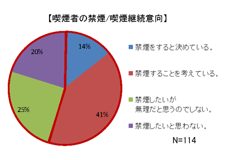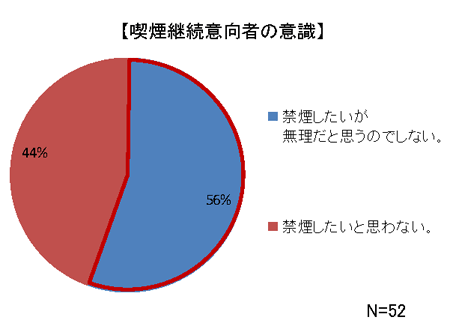 逆に喫煙継続を考えている割合は「禁煙は無理だと思うのでしない」、「禁煙したいと思わない」計45%となり、「禁煙派」が過半数を上回る結果となった。