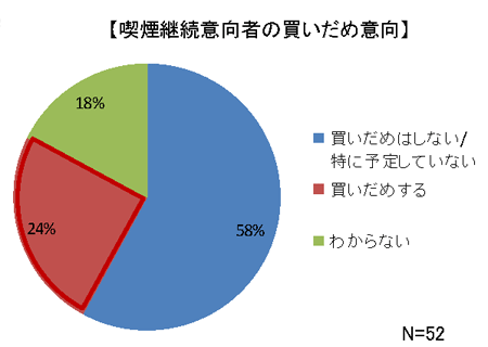 “喫煙継続派”に、タバコを買いだめするかどうかと買いだめ量を聞いたところ、「買いだめする」ことを決めている(買いだめを既にしている)人の割合は24%と約1/4にとどまった。
