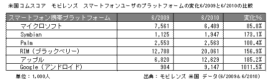 6月のコムスコア米国データではスマートフォン人口が5,284万人に達し、対前年同月比で166%、携帯市場全体での占有率は22.6%に達し仕様ではタッチパネルが市場を牽引しています。特に男女比では女性が1,274万人から2,342万人と183%の増加が見られました。プラットフォーム別ではRIMが続伸し、アップルは185%、Googleに至ってはユーザ数が900万人を超えわずか1年間で約10倍の伸長を見せました。