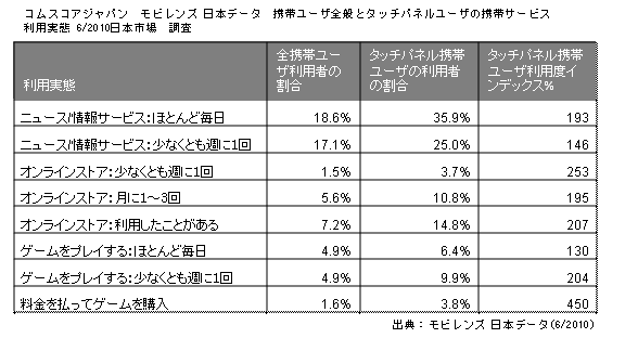 日本では携帯電話のユニークデバイスユーザ(2台持っても1人として計算)は10,090万人に対して、スマートフォンをメインに使うユーザ数は2010年6月で522万人と携帯所有者全体の5.2%に過ぎません。2010年6月時点ではAppleのiPhoneをメインに利用するユーザが252万人、Googleが43万5千人であり、日本携帯市場はスマートフォンの機種の選択幅、新サービスの導入、活発な新アプリの導入によってスマートフォン市場はここ1年で大きく変化することが予測されます。