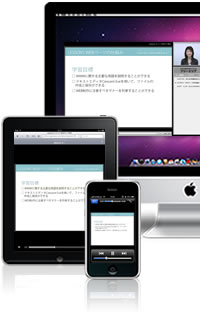 第一に、eラーニングにおいては、iPhoneやiPadなどの新しいデバイスでの閲覧を可能とし、場所の制約を受けず、