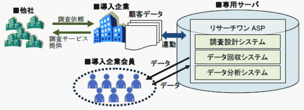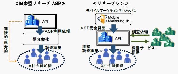 「リサーチワンASP」は旧来型のリサーチASP貸出サービスと異なり、企業各社のものとしてASPを提供し、いつでも手軽にアンケート調査を実施できる“次世代型リサーチASPサービス”です。「リサーチワンASP」導入企業は自社のためのアンケート調査を実施するだけでなく、モバイルマーケティング・ジャパンを介すことなく、他社へ調査サービスを販売することも可能です。