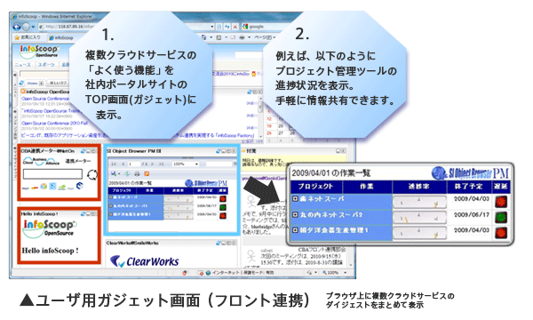 株式会社システムインテグレータ(本社:さいたま市南区代表取締役:梅田弘之、東証マザーズ 証券コード3826、以下システムインテグレータ社)は、クラウドサービスの向上を目指す業界任意団体「クラウド・ビジネス・アライアンス(Cloud Business Alliance、以下CBA)」の活動を通じて、複数のクラウドサービスをひとつのポータル画面で管理・実行するシステム(=マルチクラウドフロント連携)の研究開発を本年7月より開始し、このたび、マルチクラウドサービスのユーザガジェット間連携を実現しました(下図参照)。その成果発表第1弾を、連携するCBA会員企業と共に、CEATEC Suite 2010にて参考出展いたします。
