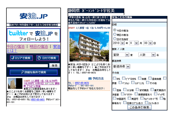 「安泊.JP」のモバイル版サイトは、PC版サイトの特長に加えて、以下の特長があります。