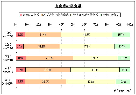 全国の18~49歳の仕事をしている未婚女性にモバイルリサーチにて、「自分自身が肉食系か草食系か」について聞いたところ、「完全に肉食系」(8.1%)、「どちらかというと肉食系」(35.9%)「どちらかというと草食系」(43.6%)、「完全に草食系」(12.4%)、という結果となった。世間では「草食男子」の対比として「肉食女子」への注目が集まっているが、実際は半数以上が「草食系」と自認しているようだ。一方、年代別で比べたところ、30代のうち「完全に肉食系」「どちらかというと肉食系」と回答した人が50%にのぼり、他の年代よりも高いことがわかった。「アラサー」「アラフォー」という言葉があるように、10~20代よりも30~40代の女性のほうが何事にも積極的なのかもしれない。
