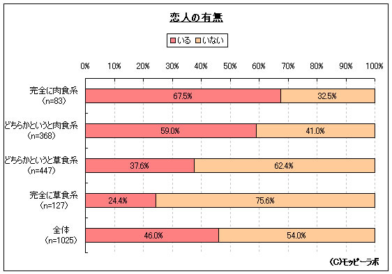 ■肉食女子の約7割が恋人アリ!草食女子では2割強にとどまる