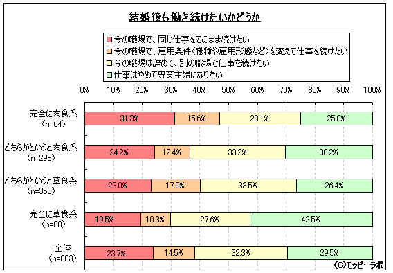 結婚願望をもつ人に対して「結婚後も働き続けたいかどうか」、出産願望をもつ人に対して「出産後も働き続けたいかどうか」について聞いたところ、全体の約7割がいずれかのかたちで「仕事を続けたい」と回答した。また、「肉食系」「草食系」などのタイプ別で比べたところ、「完全に草食系」の42.5%が結婚後は「専業主婦になりたい」、46.9%が出産後は「専業主婦になりたい」と回答し、「完全に肉食系」(約25%)と大きな差があることがわかった。