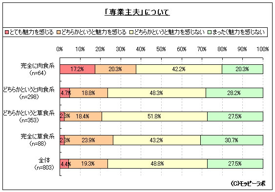 結婚願望をもつ人に対して「『専業主夫』をどう思うか」について聞いたところ、「どちらかというと魅力を感じない」「まったく魅力を感じない」と回答した人が76.3%にのぼり、女性にとってはあまり受け入れ難いスタイルであることがわかった。ただし、「肉食系」「草食系」などのタイプ別で比べたところ、「完全に肉食系」の17.2%が「とても魅力を感じる」、20.3%が「どちらかというと魅力を感じる」と回答し、約4割の肉食女子が「専業主夫」を魅力的に感じていることがわかった。自分に代わって家庭をしっかり守ってくれる「専業主夫」は、結婚しても何事にも攻め込んでいきたい(であろう)肉食女子にとって好都合なのかもしれない。