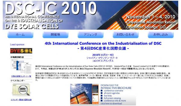第4回のInternational Conference on the Industrialisation of Dye Solar Cells (DSC-IC 2010)が、 IntertechPira の主催、 Dyesol Limited などの後援で今年も開催されます。 今年は、米国コロラド州コロラドスプリングスにあるCheyenne Mountain Resortで、11月1日~4日まで開催されることになっています。