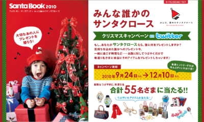 『サンタブック』は1987年より、大切な人へのクリスマスの贈りものを選んでいただくカタログとして毎年たくさんのお客さまにご利用いただいてまいりました。このたび「みんな、誰かのサンタクロース」をコンセプトに、プレゼントや、一緒に過ごす時間などクリスマスに関係のあるさまざまなエピソードについてつぶやいていただき、みなさんでクリスマスを盛り上げていこうと考えています。