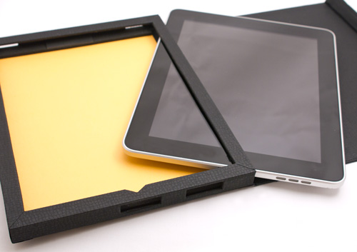 iPad本体の固定には、クッション材の発泡ゴムと滑り止めシートをケース内部に配置し、「収納=固定」を実現しました。もちろん特定の方法で取り出すことも可能です。