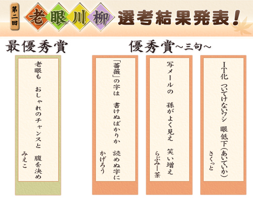 応募点数 2,036句から最優秀賞1句、優秀賞3点に加え、新設した特別賞8句をサイトで公開中。最優秀賞に『老眼も おしゃれのチャンスと 腹を決め』、優秀賞には『写メールの 孫がよく見え 笑い増え』『IT化 ついてけないワシ 眼低下(あいていか)』『「薔薇」の字は 書けぬばかりか 読めぬ字に』が選ばれました。