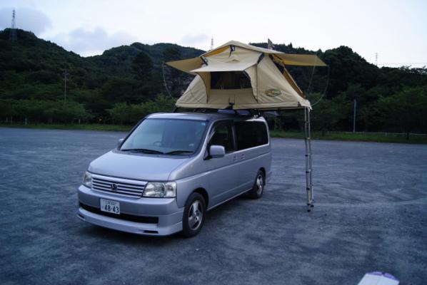 ルーフテントを縦に取り付ければ、1台分の駐車スペースで展開が可能で道の駅などでの車中泊に使えます。
