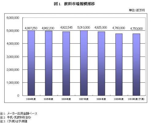 2009年度の飲料市場総規模(牛乳・乳飲料を含む)は、メーカー出荷金額ベースで前年度比96.6%の4兆7,600億円と、前年度と同様に縮小した。消費者の購買意欲の低下に加えて2009年夏の天候不順が大きく影を落とした。また、消費者の購買意欲の低下により、茶系飲料やミネラルウォーター等の自作できる飲料については、購入を控えて自宅から持参するという節約傾向が顕著となった。