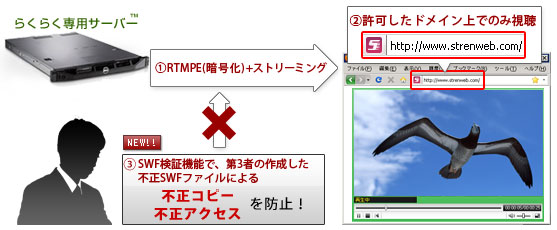 SWF検証機能とRTMPEを組み合わせることにより、らくらく専用サーバーTMでの、キャプチャができないコンテンツ保護化されたオンデマンド動画配信が可能となります。当サービスにより高額のDRMに依存しない、コンテンツ保護配信を低価格&定額で、しかも簡単に行っていただけることを主眼としております。