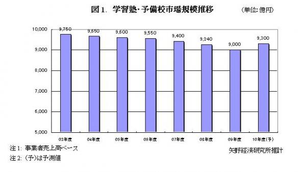 ◆2009年度学習塾・予備校市場は前年度比2.6%減の9,000億円に縮小、不況と低価格競争の激化が市場を圧迫する一方で大学志願者の増加、学校授業の難化が個別指導塾を下支えし、縮小幅は抑制