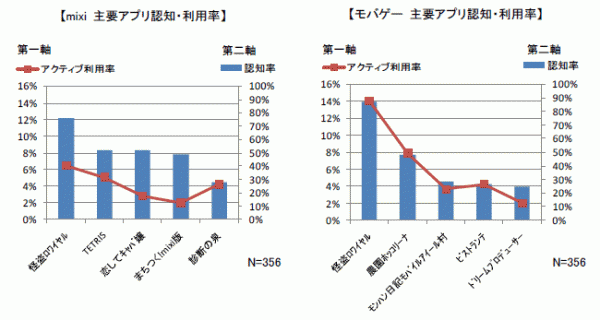 その他、mixi(PC版とモバイル版)、モバゲー、GREEのソーシャルアプリの主力タイトルでの認知率、アクティブ利用率を比較したところ、認知率ではmixiモバイルでの「TETRIS」52.0%、「恋してキャバ嬢」51.7%「まちつく」48.9%の認知率の高さが目立った。アクティブ利用率に関しては、前出のモバゲーでの「怪盗ロワイヤル」14.0%、「農園ホッコリーナ」7.9%が他SNSサイトのソーシャルアプリ利用率を大きく上回った。