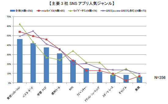 「好きなソーシャルアプリのジャンル」はSNSプラットフォームによって違いがあることが判明した。「育成シミュレーション」は全体で46.3%と一番人気が高く、一番ソーシャルアプリのために利用しているケータイSNS別に見ると、「モバゲー」利用者では、62.2%と他ジャンルを大きく引き離し人気があると分かった。「GREE」利用者は、「パズル・ボードゲーム」(全体2位)が54.8%と、こちらは「モバゲー」利用者の27.0%を大きく引き離した。「mixi」利用者では、「育成シミュレーション」、「パズルボード」、「学習・クイズ」と全体の順位と変わらない人気傾向を確認できた。