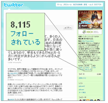 google mobile 検索エンジンにて3位(キーワード:インターンシップ)の「インターンシップ比較ナビ」(http://www.intern55.com/)において、インターンシップ情報を学生に対して紹介致します。現役大学生・大学院生8,000人以上にフォローされているツイッターアカウントIntern55(http://twitter.com/Intern55)と連動させています。当アカウントは国内のインターン関連アカウントでは最大のフォロワーを抱えています。