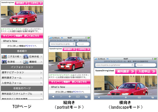 資料請求・入校申込みリンクボタンは横向き(landscapeモード)においてもファーストビューに表示されるよう、上部へ設置するなどiPhoneインターフェースに最適化したデザインとなっております。