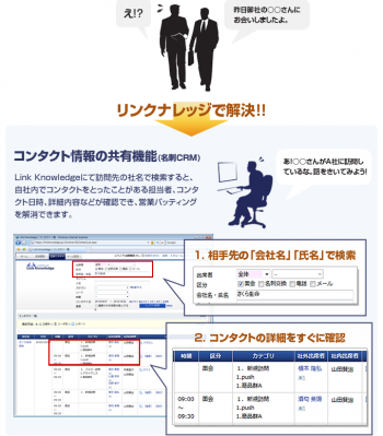 Link Knowledgeを導入することで、訪問した相手の名刺は必ずデータ化して訪問情報を共有し、営業バッティングの解消を狙います。名刺を社内で共有することの習慣付けにより各営業担当者の活動を口頭で確認する必要がなくなり、営業の生産性が向上します。