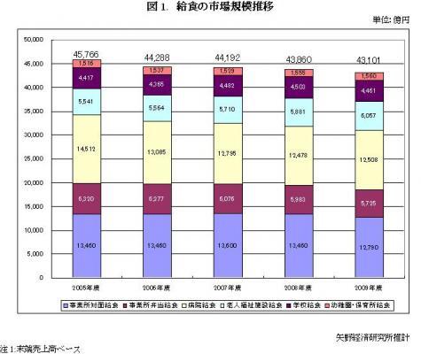 2009年度の給食総市場規模は、前年度比98.3%の4兆3,101億円と推計した。既に集団給食から“集団”という単語が外れるくらいに、様々な給食提供パターンが生まれている。