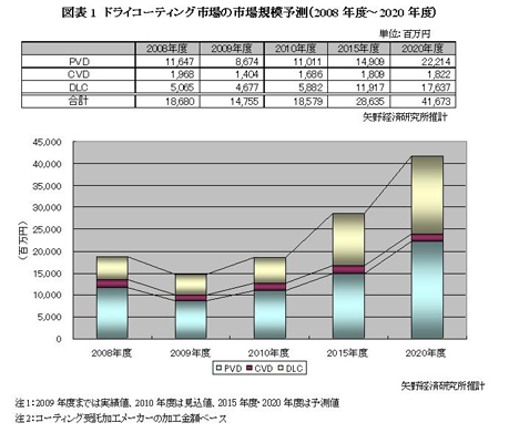 2009年度は自動車産業の落ち込みによる影響を受け、2007年度のピーク時に比べ、約65%の14,755百万円まで市場は縮小した。しかし2010年度に入り自動車産業での回復の兆しが見えてきたことで、自動車部品だけでなく自動車産業と関連の深い切削工具、金型分野での需要も増加傾向に転じ、その結果ドライコーティング市場は2010年度には前年度比125.9%の18,579百万円になる見込みである。