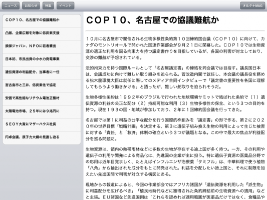 日本で唯一の環境・CSRのビジネス情報誌「オルタナ」を発行する株式会社オルタナ(東京都渋谷区、代表取締役 森 摂)は、 農漁業専門のITベンチャーであるフウド株式会社(東京都町田市、代表取締役 齋藤 悠)と共同で、iPadアプリ「オルタナApp」をリリースしました。今月29日まで名古屋市で開催されている生物多様性条約第10回締約国会議(COP10)に絡んで組まれた生物多様性特集号の全誌面を読めるとともに、環境・CSRに関係する編集部発の最新ニュースも閲覧できます。
