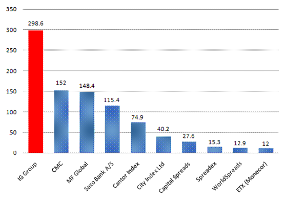 調査はFX(外国為替証拠金取引)専業会社並びに証券会社を除くCFD専業の主要10社の公表資料を基に独自に算出いたしました。結果は次の通りです(2010年10月現在)。
