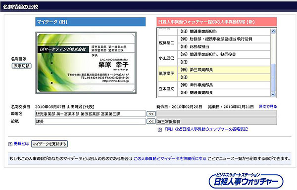 まず1つ目はデータの鮮度という側面です。導入前は部署異動や連絡先の変更があってもデータベースを都度更新させることが困難でした。しかし、Link Knowledgeならデータベースをリアルタイムで更新可能です。ダイヤモンド社、日経人事ウォッチャー提供の人事異動情報が自動で配信され、最新の情報が常にホーム画面に表示されます。自分が保有する名刺の人物の肩書きが変わった場合も、社内の誰かが新しい名刺をいただいてくるとその変更が通知され、自分が持つ名刺に情報を反映させることが可能です。