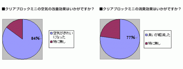 室内の臭いや空気の質を向上させるためにトルネックスが開発した「クリアブロックミニ」は、今年1月に発売以来、幼稚園、病院、事務所、銀行、個人宅など様々な場所のウイルス除去・空間除菌、消臭にご利用頂いています。実際にご利用頂いている皆様にアンケートを実施し、クリアブロックミニによる空気の改善調査を行った所、85%の方が「空気がきれいになった気がする」と回答しています。また、クリアブロックの消臭効果について、77%の方が「臭いが軽減した」と回答しています。また、商品をご利用頂いているレディースクリニックからも、「医療廃棄物の臭いが気にならなくなった」とのコメントを頂いています。