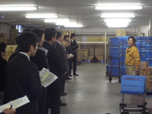 その後、実際に改善された倉庫に行き、現場研究を行いました。見学者からは説明の都度、さまざまな質問や感想が出され、活発な質疑が行われました。棚の配置、格納方法、作業員の動線、プラットフォームの様子など改善活動の一部始終を五感で理解いただいたと思っております。