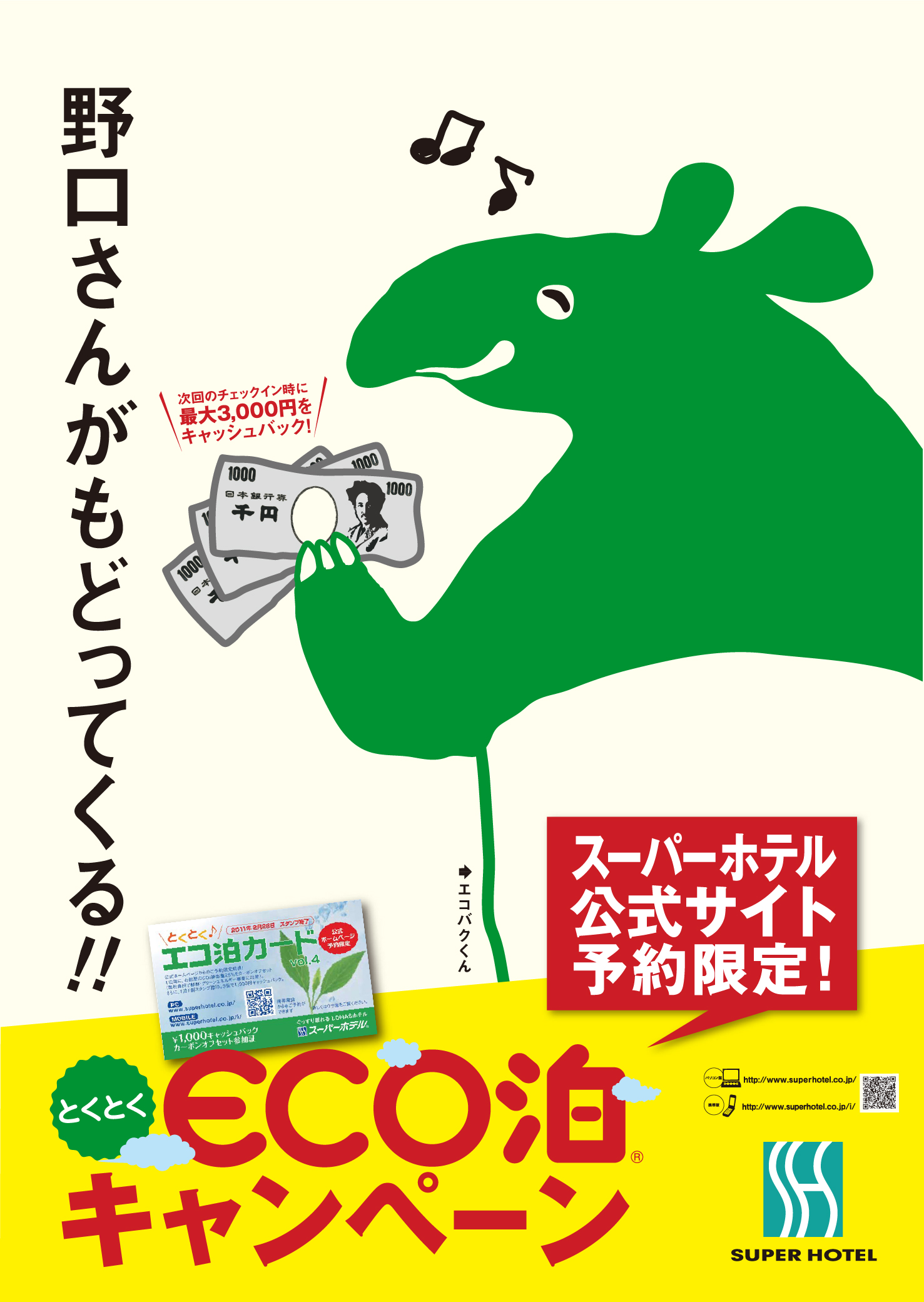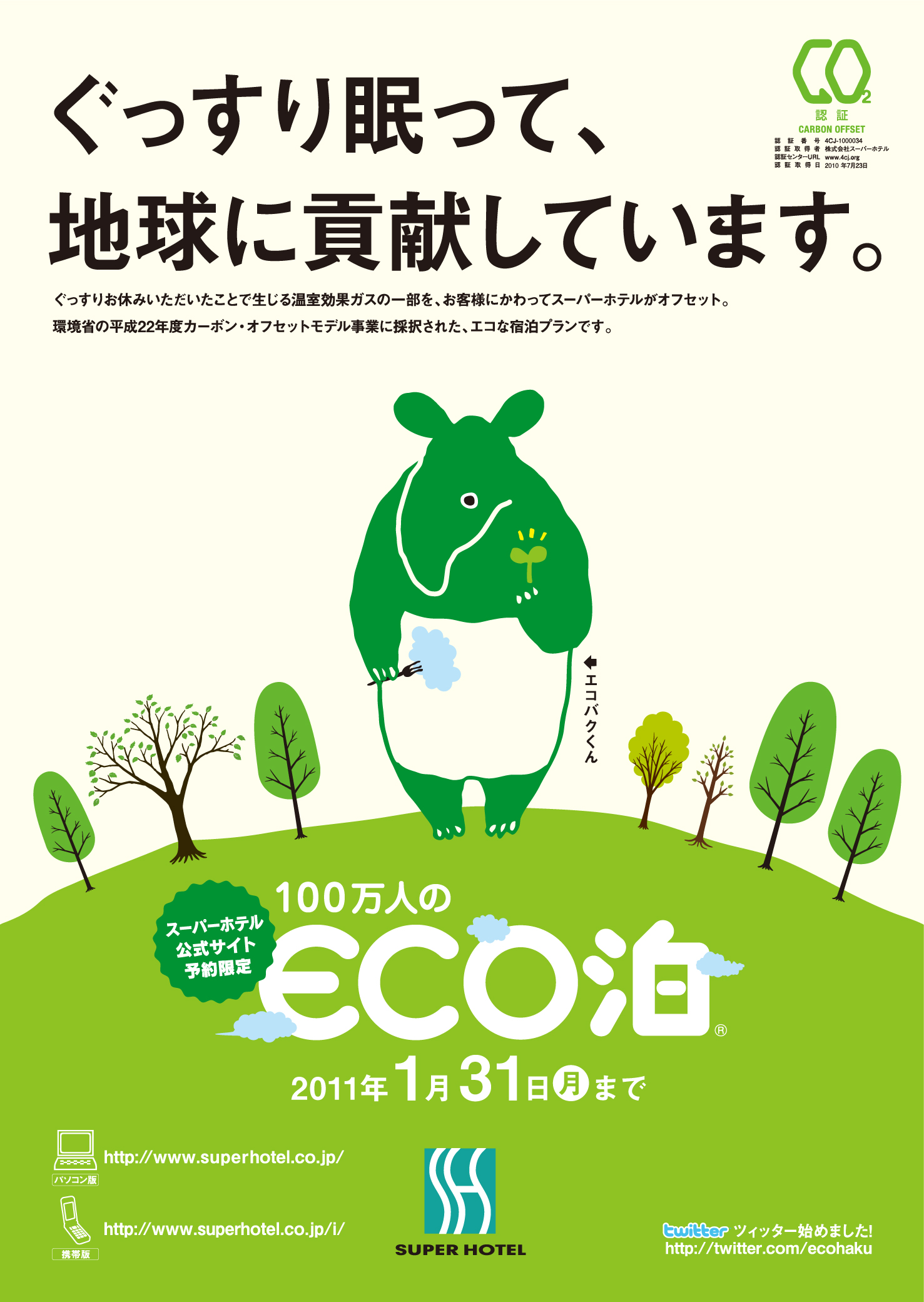 株式会社スーパーホテル(本社:大阪府大阪市 代表取締役社長 山村孝雄)は、2010年11月1日~「100万人のエコ泊(カーボン・オフセット)」キャンペーンを開始しますので、お知らせ申し上げます。今回の「100万人のエコ泊(カーボン・オフセット)キャンペーン」は、11/1~1/31にスーパーホテル全94店で実施いたします。期間中インターネットから宿泊予約いただく方の宿泊にかかわるCO2の25%分をオフセットするものです。また、キャンペーン専用ページを作成するとともに、ツイッター等を活用し、20代~30代の環境意識の高いビジネスパーソンに幅広く告知し、カーボン・オフセットの普及啓発に努めるとともに、エコ泊利用者の増加、CO2削減量の増加をめざします。